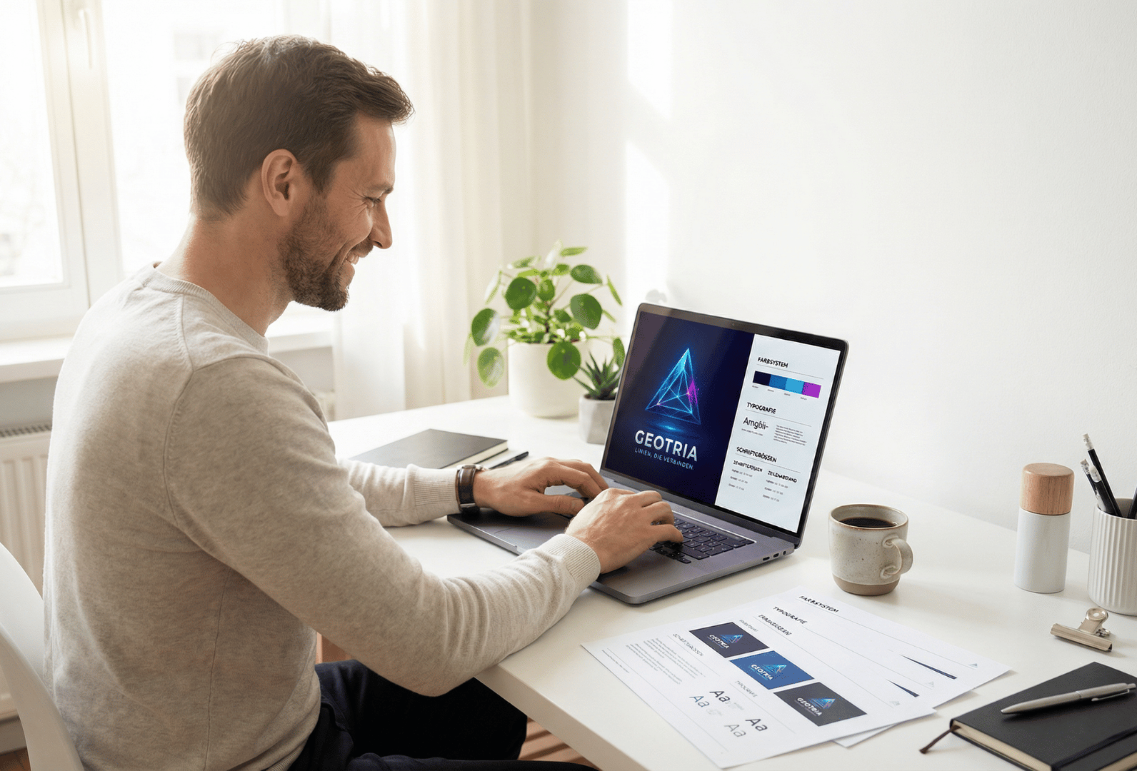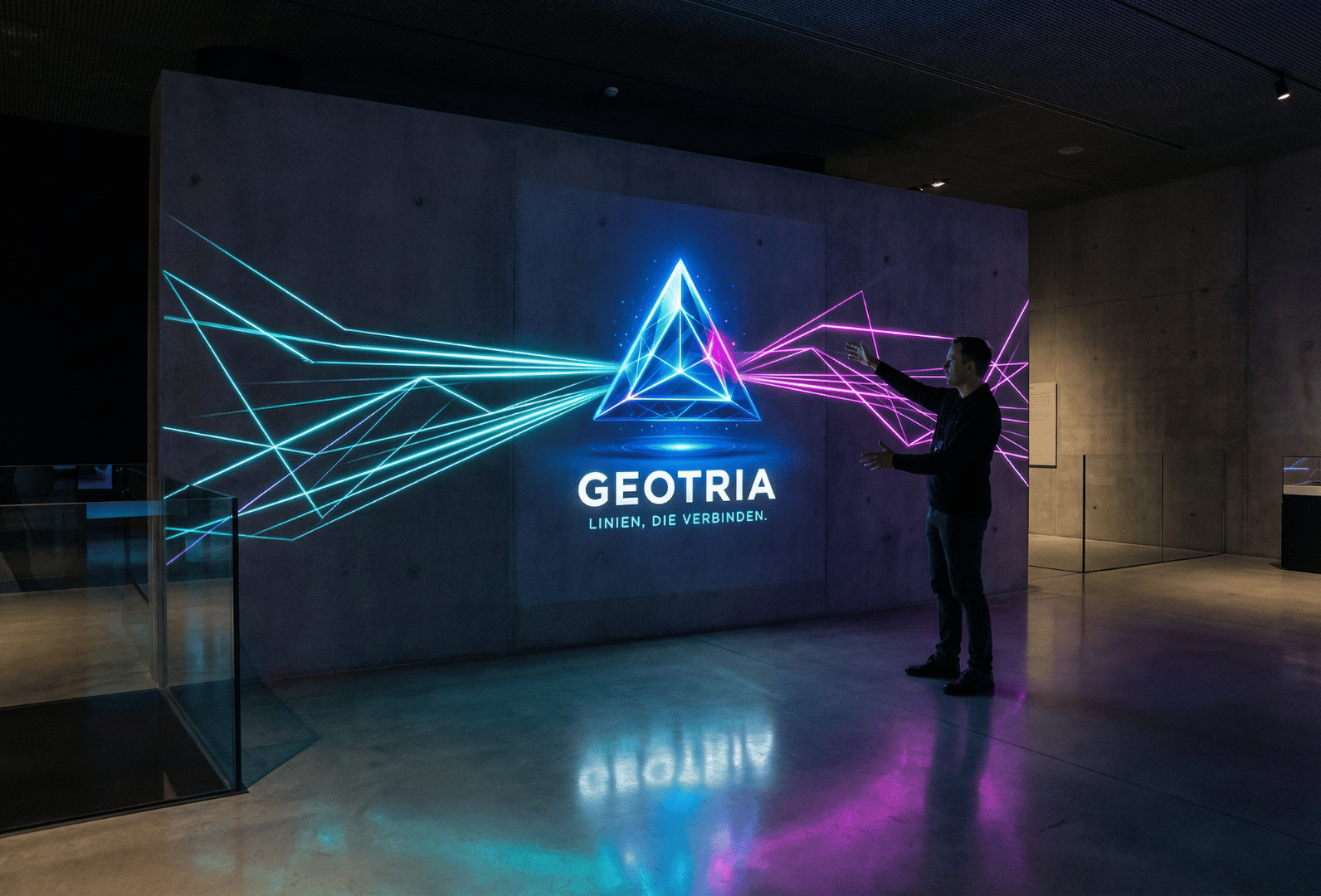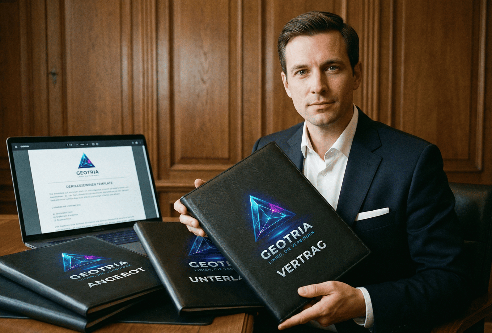 Mitarbeiterin präsentiert Geotria Teamkleidung mit Logo für Employer Branding und Teamidentität
