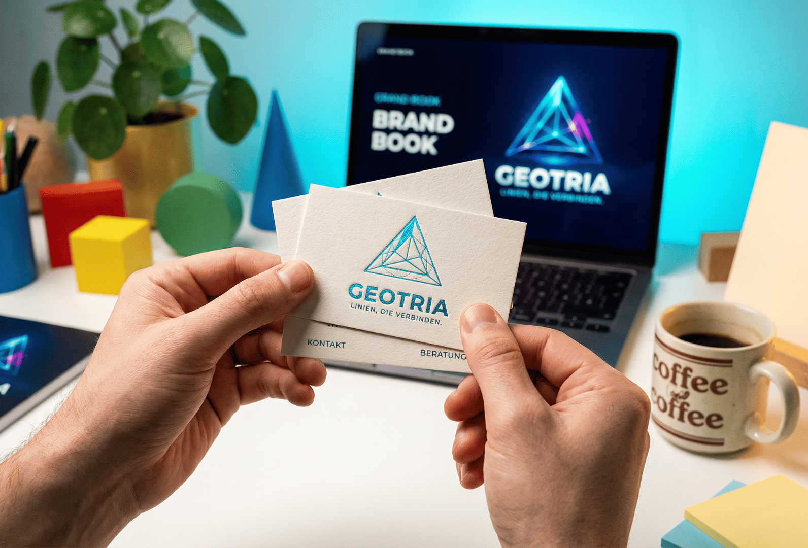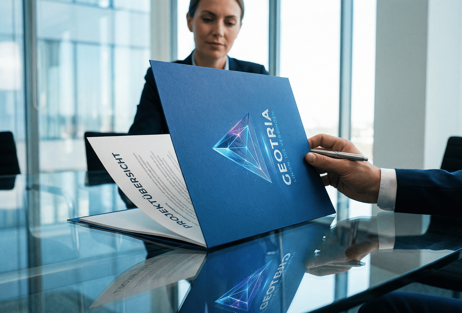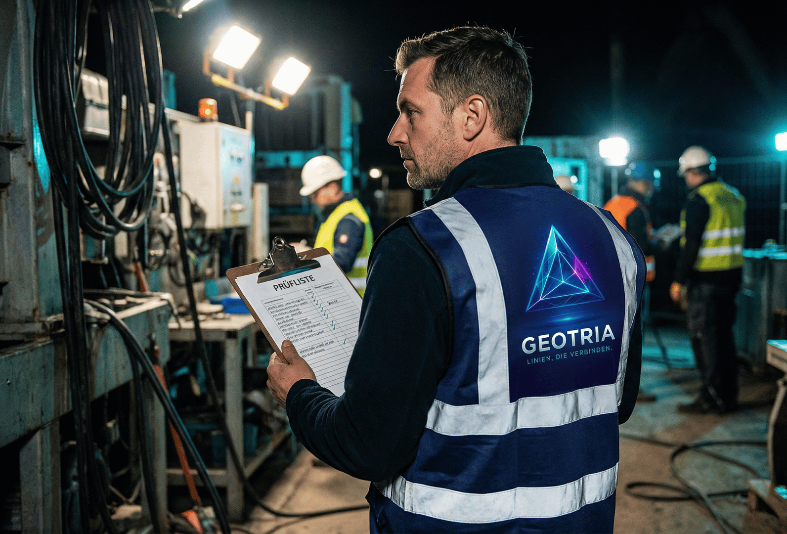 Mitarbeiterin präsentiert Geotria Teamkleidung mit Logo für Employer Branding und Teamidentität