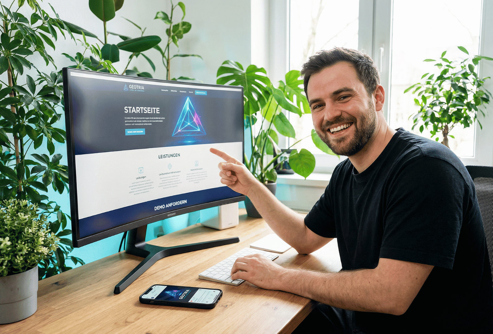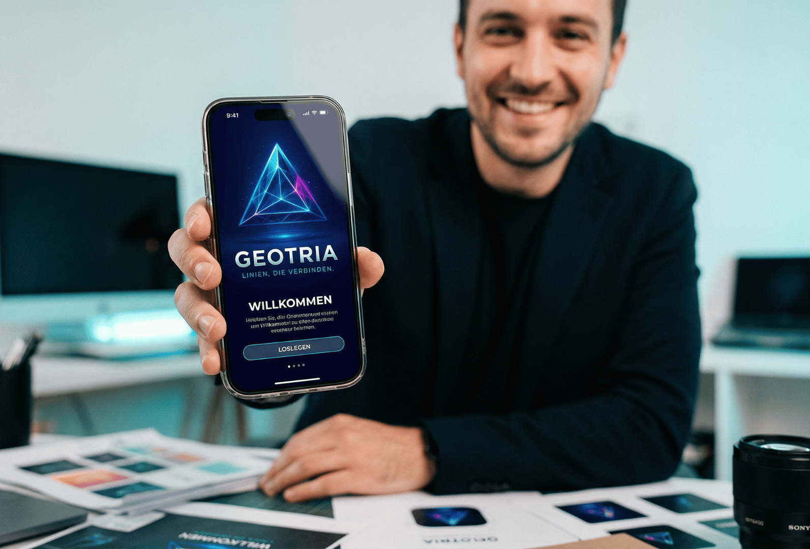 Frau präsentiert die Geotria App auf dem Smartphone vor Ringlicht in moderner Social-Media-Content-Umgebung